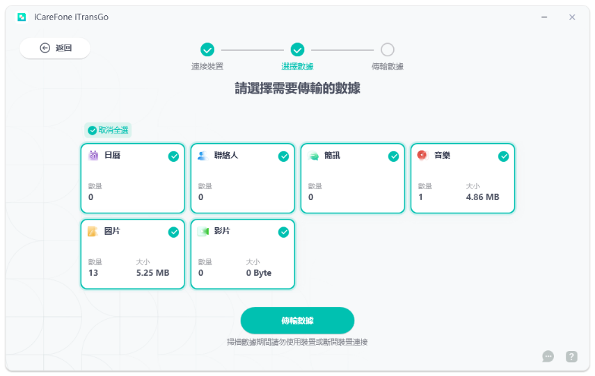 你會看到可以轉移的數據類型列表,如聯絡人、照片、影片、訊息等。勾選你想轉移的資料類型,軟件會自動識別並準備轉移。