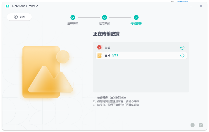 只需要使用 iCareFone iTransGo 工具,即可快速完成。操作簡單,無需重新設置 iPhone,只需將安卓和 iPhone 連接到電腦,選擇 [Android to iOS] 模式,幾個步驟內就能將聯絡人、照片、音樂等完整地搬到 iPhone 上。