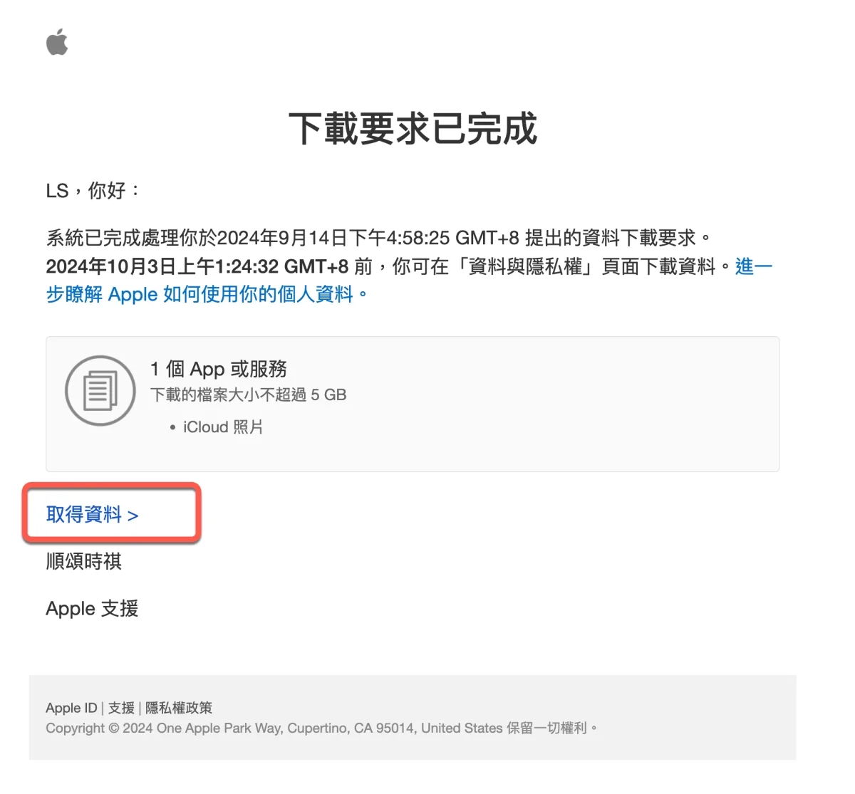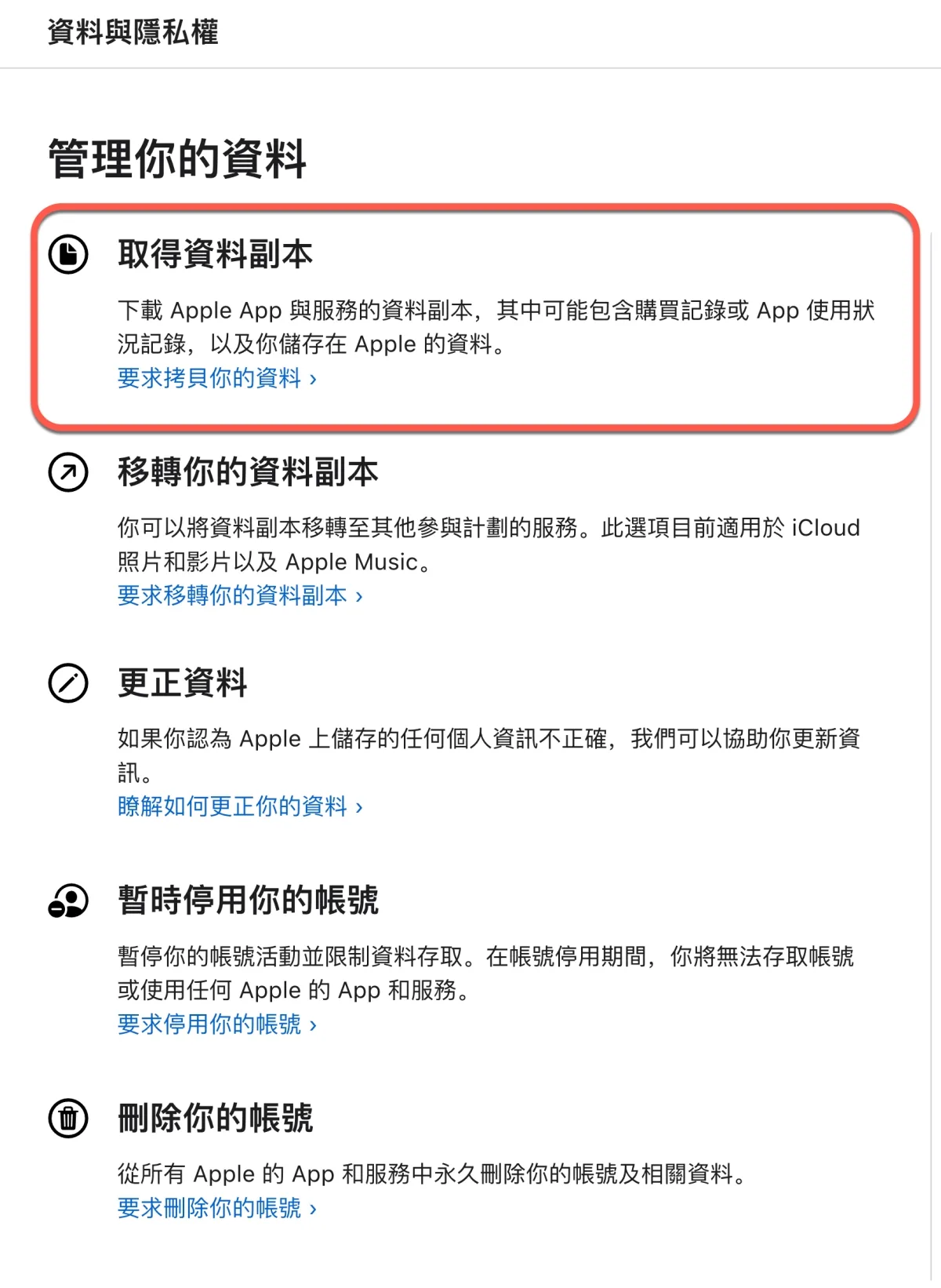 這邊就可以下載各種資料,其中包括在 iCloud 中的各種資料、資訊,還有你 Apple ID 下的各種內容。