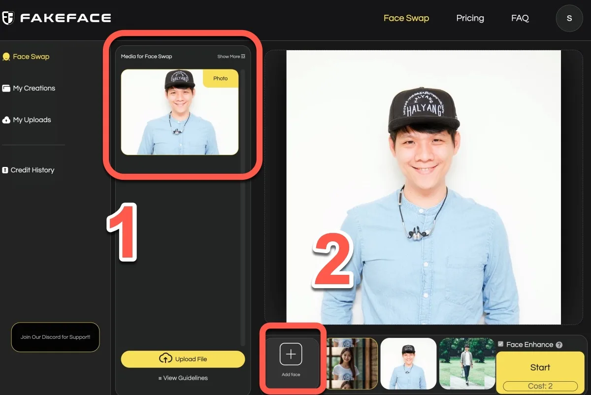 使用分二個部份,1 的地方是放置要被換的照片或影片,2 是放要取代進去的臉,簡單的說,在 1 裡的臉會變成 2 。