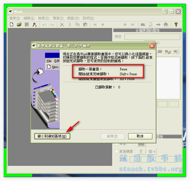 接下來我們就可以先按下〝縮小到通知區域〞將畫面先最小化,再按下熱鍵就可以開始錄製囉,一個有三種錄製模式