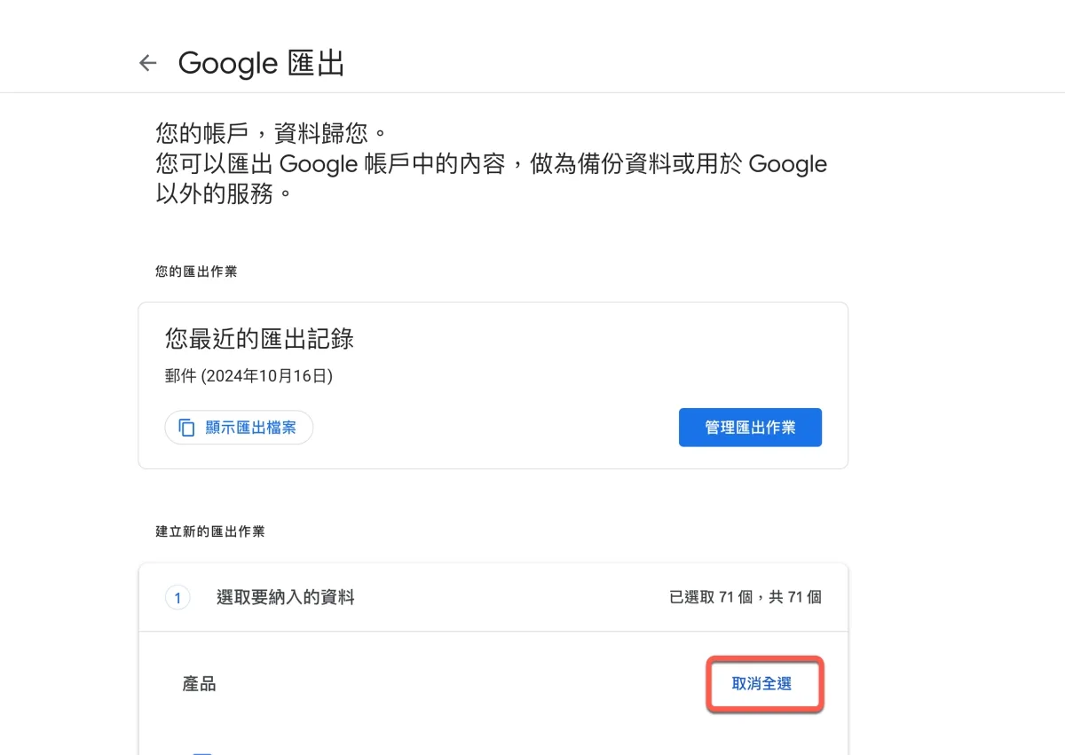 首先到 Google 匯出功能:[epcl_button label="請點我前往" url="https://takeout.google.com/" type="primary-style" color="light-blue" size="regular" target="_blank" rel="nofollow"][/epcl_button]