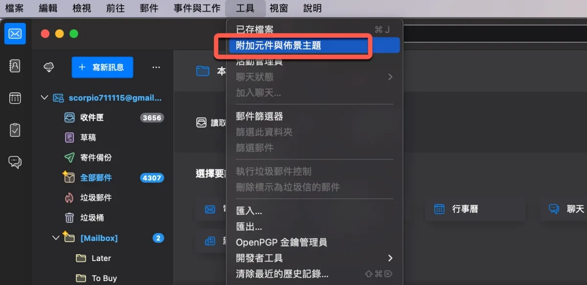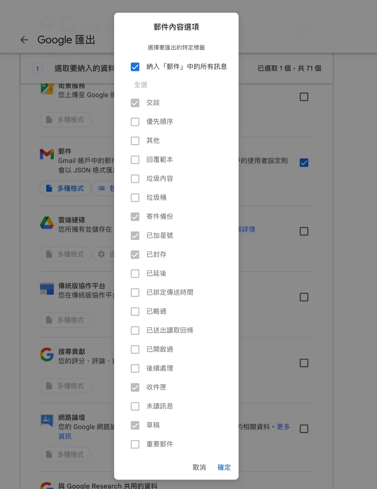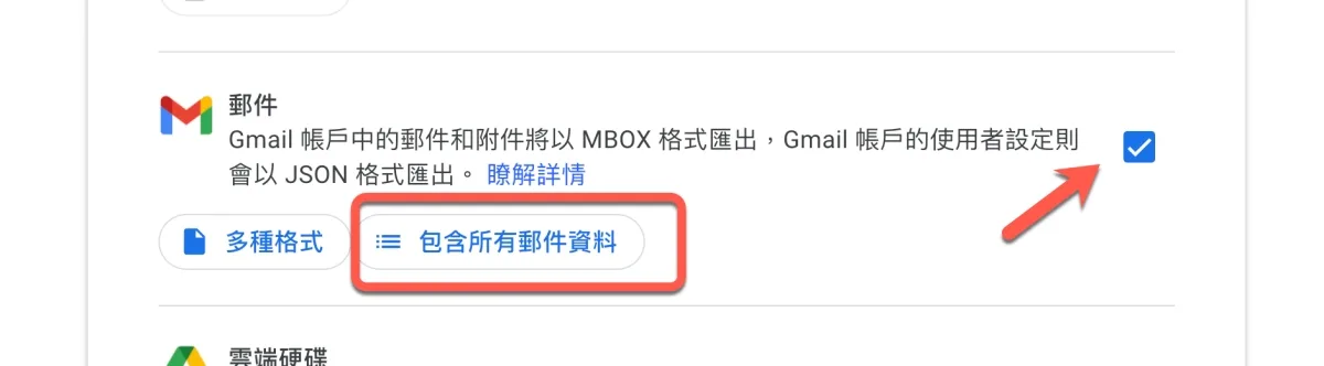 然後往下拉找到郵件,勾選起來,再點擊包含所有郵件資料。