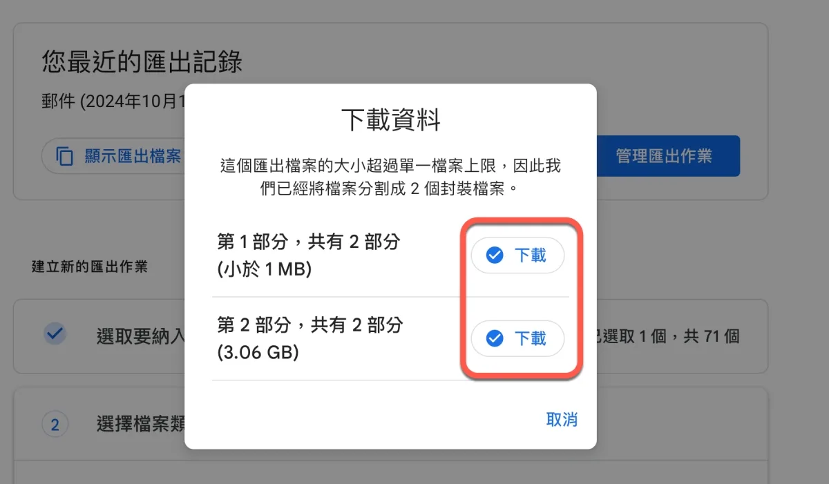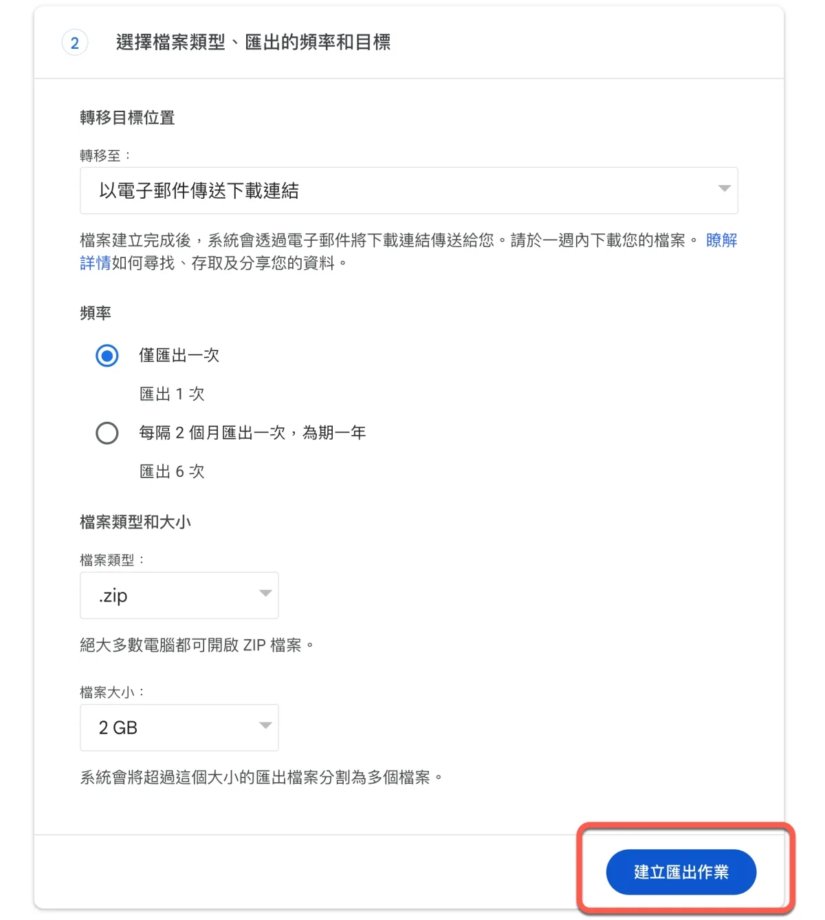 這邊基本上不用選什麼,如果你覺得信件量可能比較大,可以多切分檔案大小,再按下建立匯出作業。