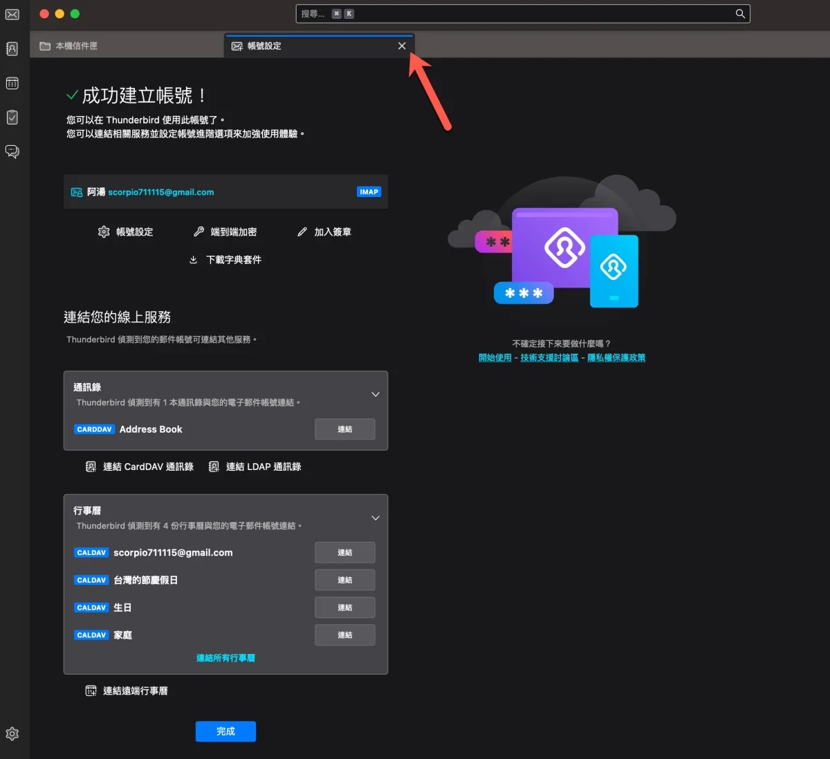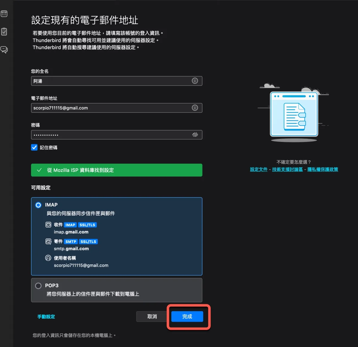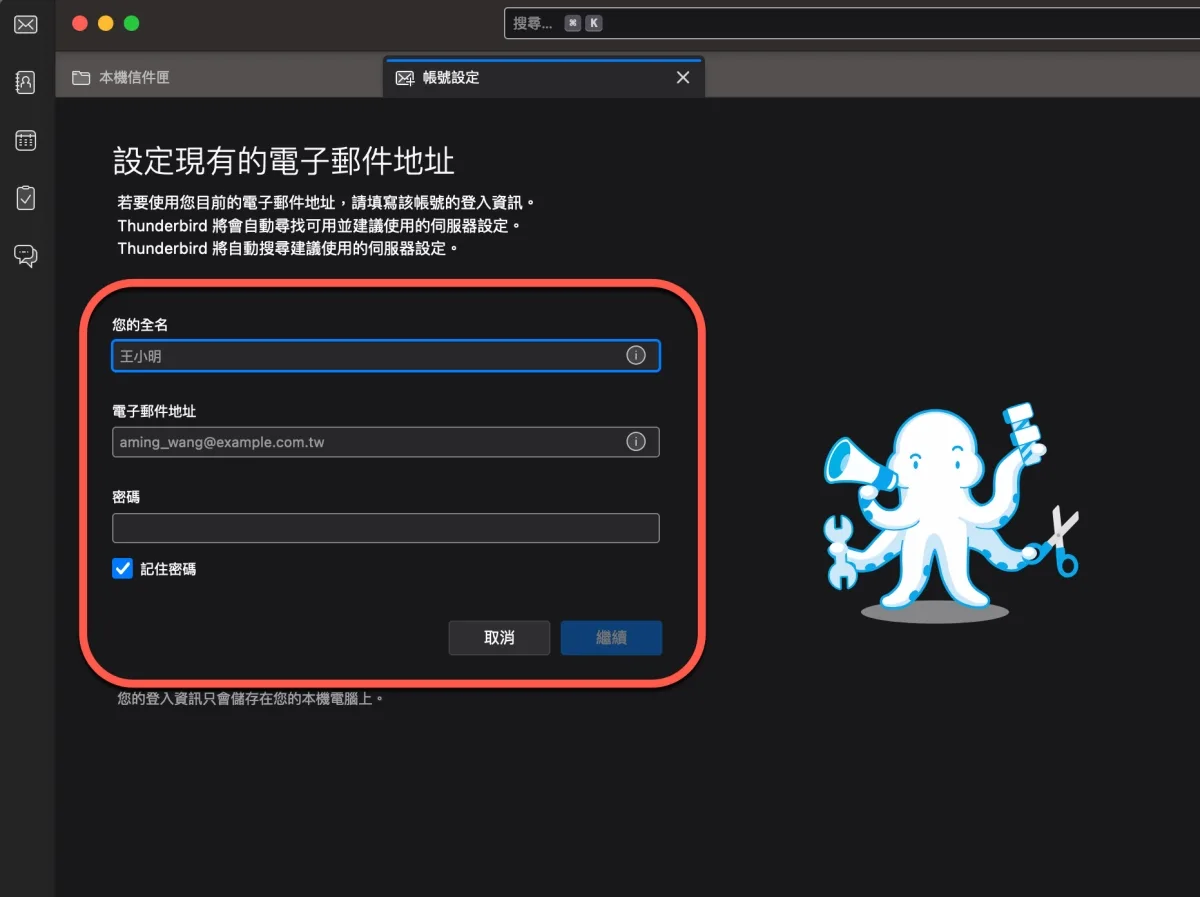 然後我們要匯入 mbox 的工具是 [epcl_button label="Thunderbird" url="https://www.thunderbird.net/zh-TW/" type="primary-style" color="light-blue" size="regular" target="_blank" rel="nofollow"][/epcl_button],去到官網先下載軟體安裝,執行後第一次要先設定 Email 帳號,這邊要登入的是你要匯入信件的帳號,gmail 需要填入全名,包括 @gmail.com。