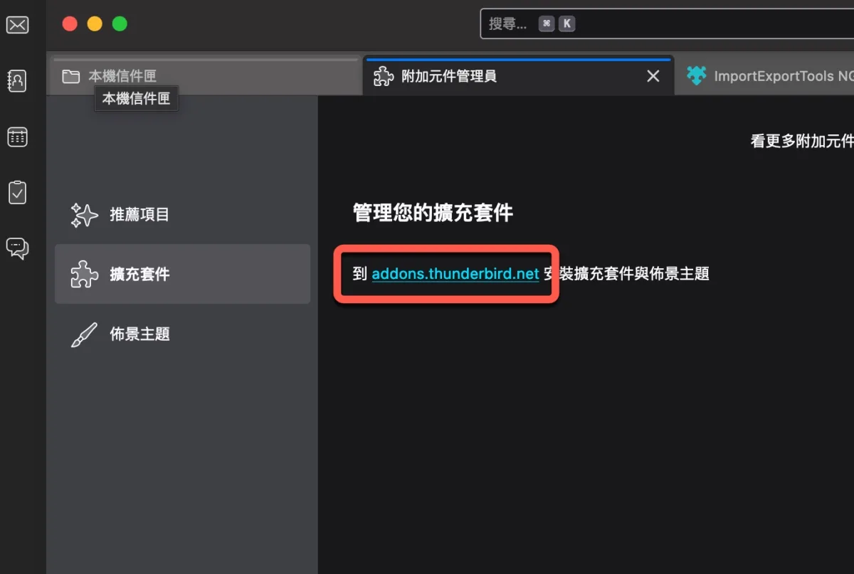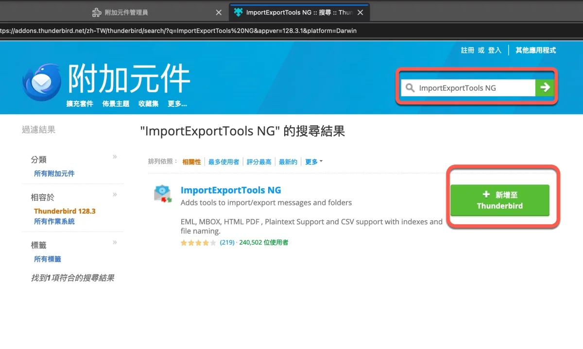 附加元件用搜尋的「ImportExportools NG」,按新增至 Thunderbird。