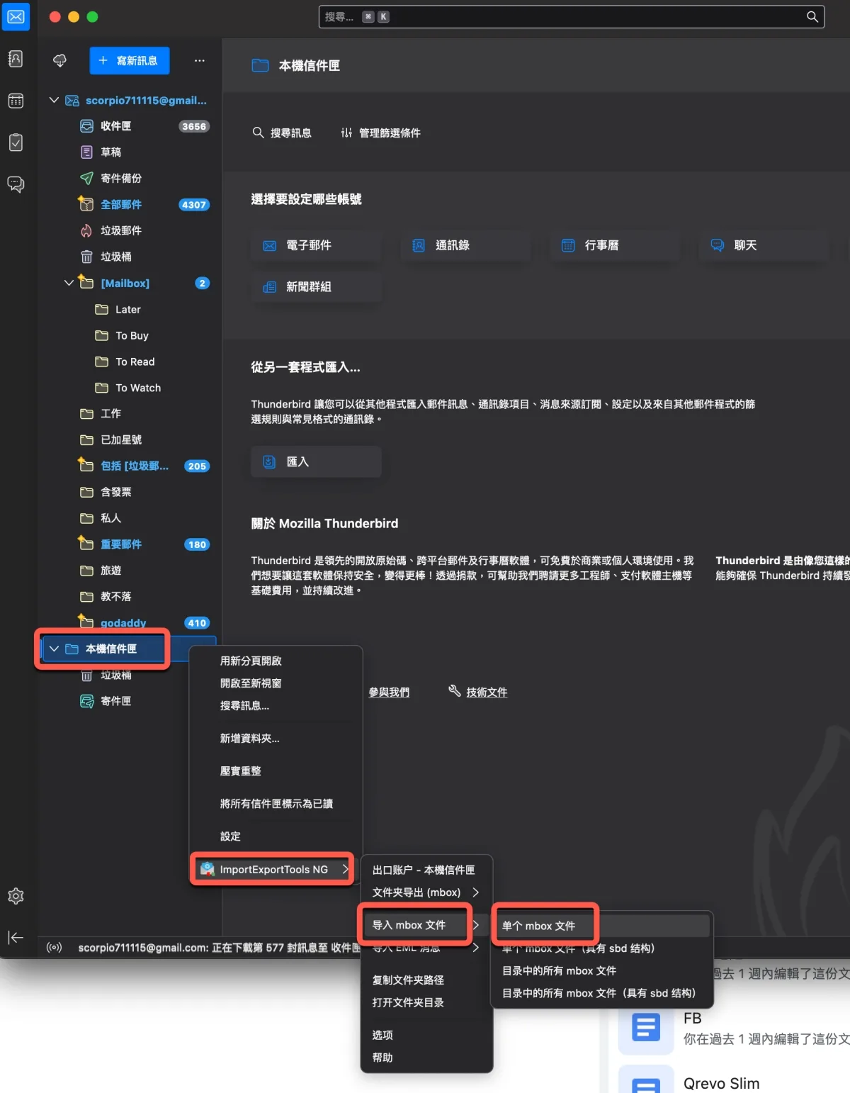 然後回到本機信件匣這裡,上方可以看到你新增的 Gmail 帳號,下方是本機,本機這裡右鍵後就會看到「ImportExportools NG」,再選擇導入 .mbox,然後選擇單個,去選擇你從 Google 匯出的 .mbox 檔案。