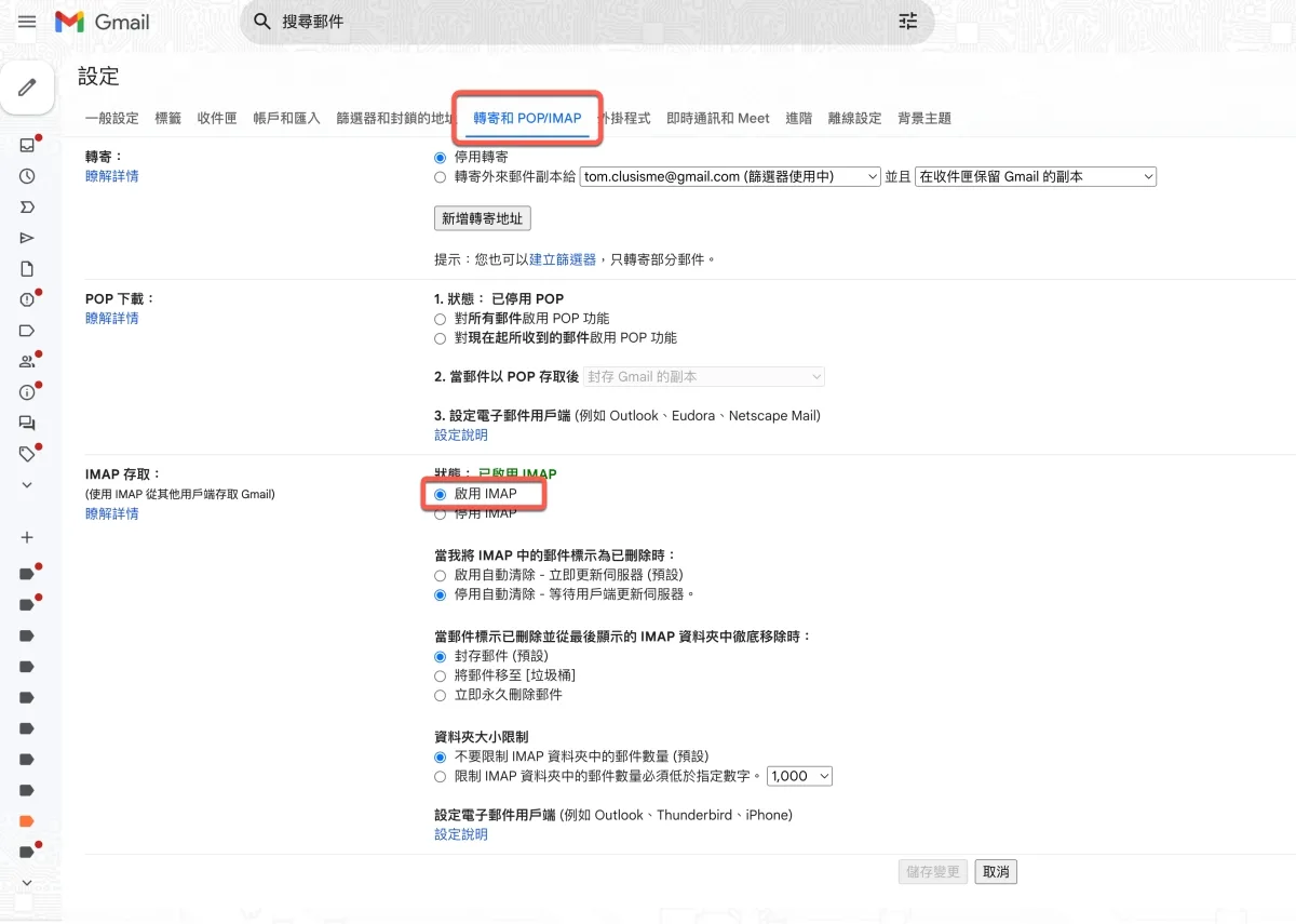 進到「轉寄和 POP/IMAP」將 IMAP 打開,記得不是 POP,這邊跟大家科普一下,POP 只能下載回來,如果你用第三方工具是同步不回 Gmail 的,IMAP 才是雙向傳送。