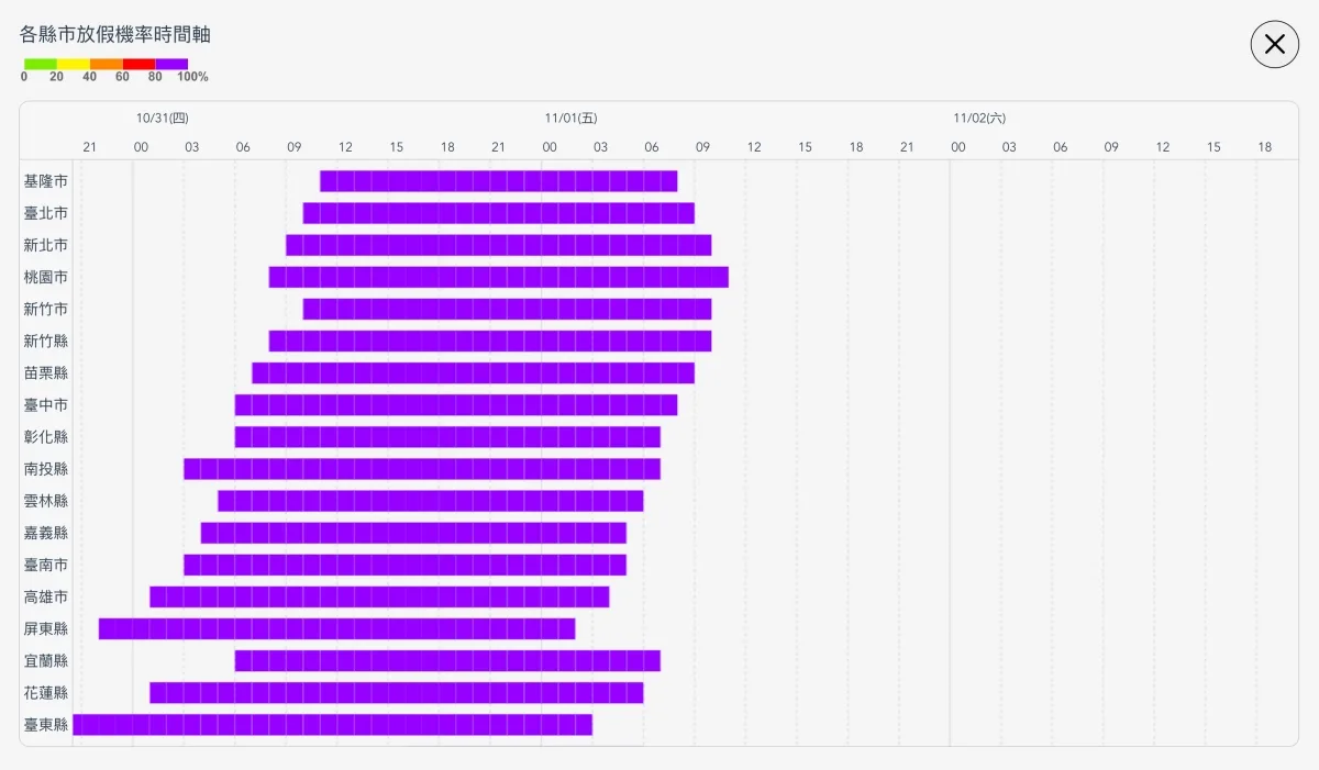 最有趣的是還有各縣市放假機率時間軸,像這次穿心颱,基本上是 100% 沒錯啦,也真的都全放了。