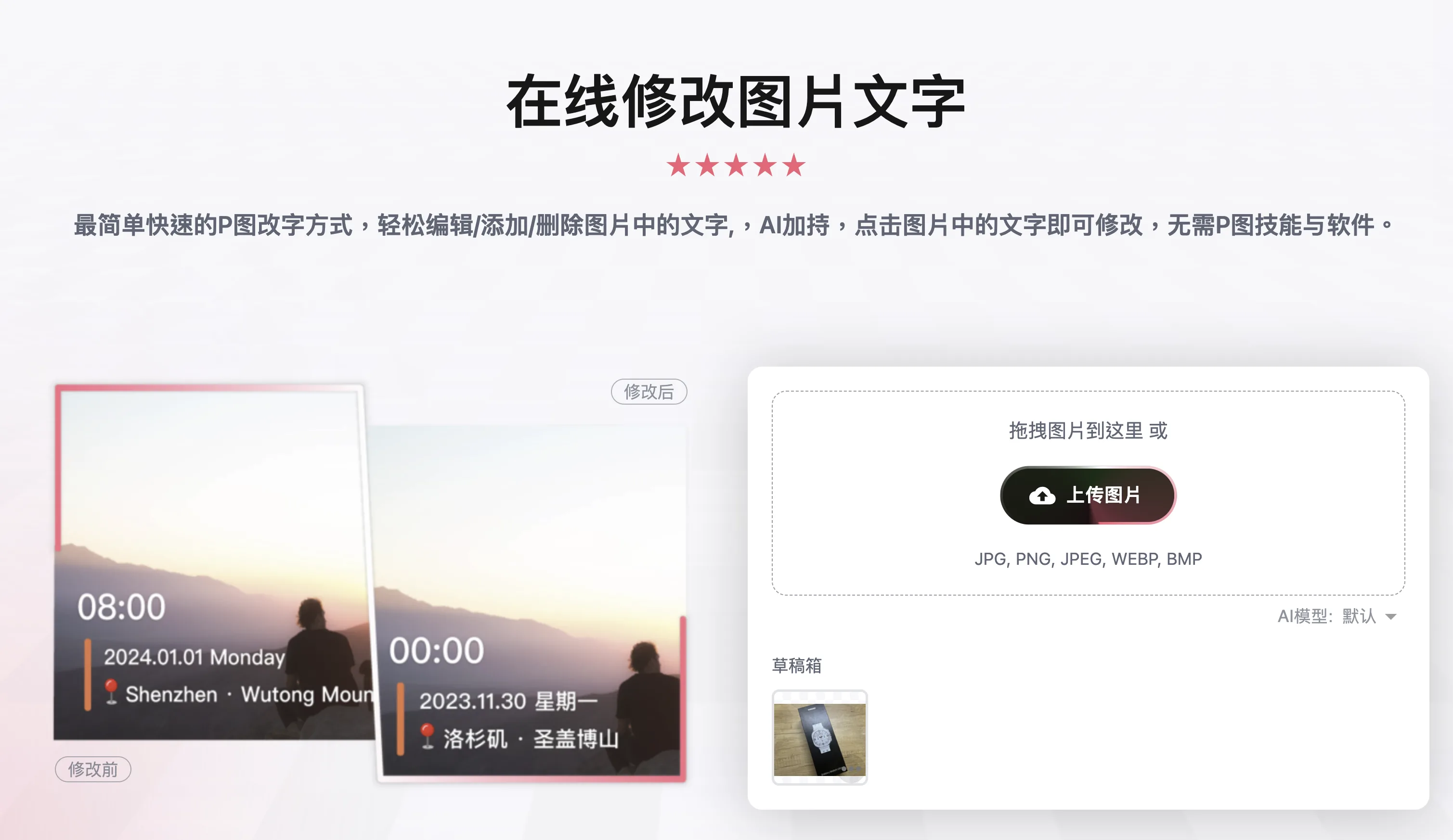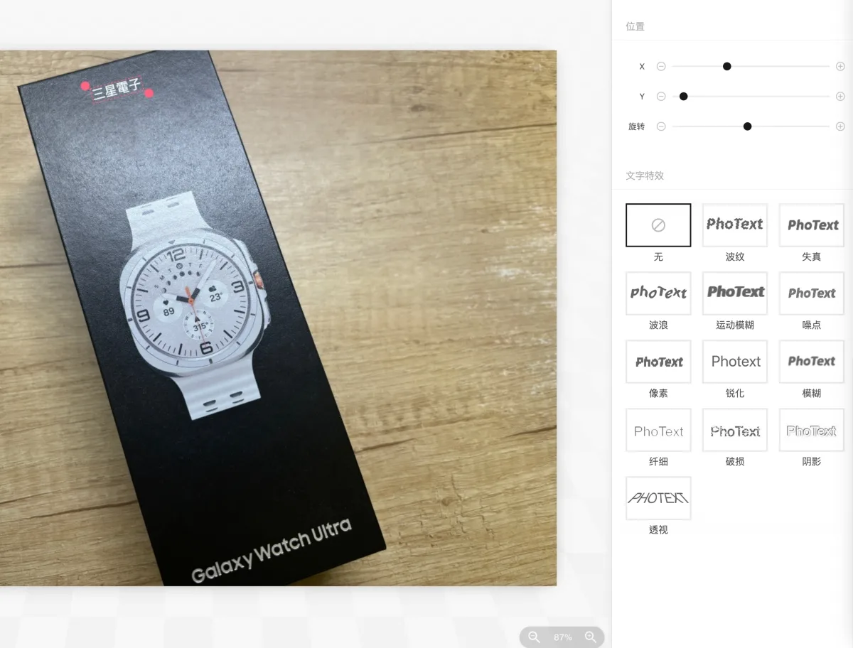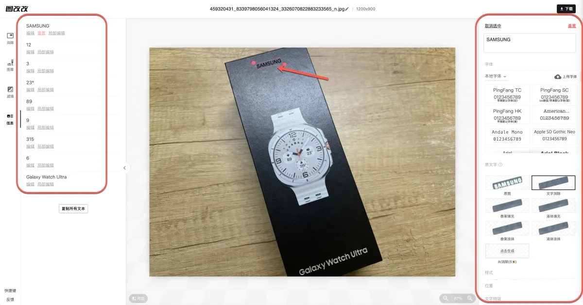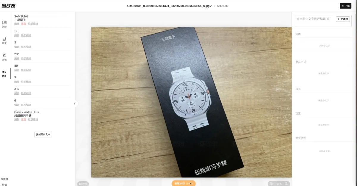 比如我上傳這盒裝封面照片,以為沒什麼文字,我沒想到它連手錶上的數字全都偵測到,而且很精準,所有偵測到的文字都會顯示在左側,點擊後都能直接改,右邊是改後的文字、字型、效果等調整。