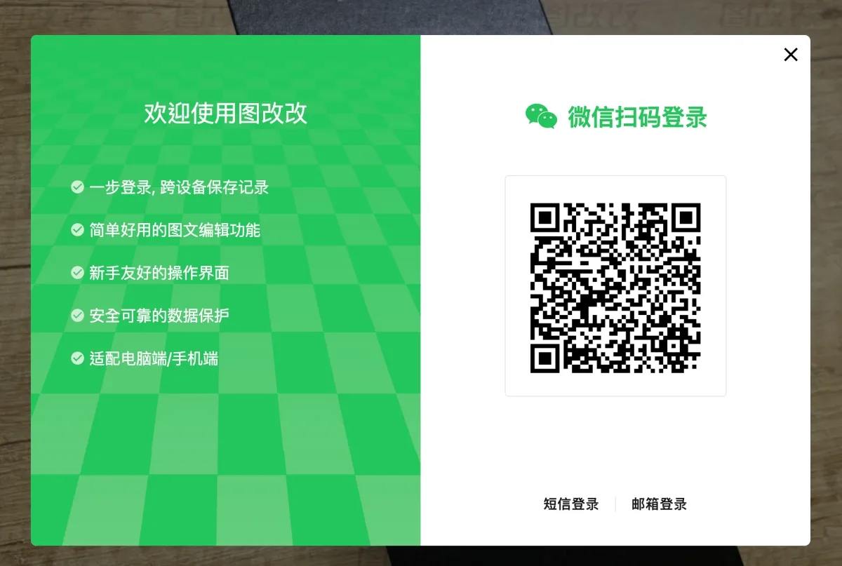 進入網站後,可以先不用登入帳號,在開始之前先分享一下,登入是要用微信帳號,所以手機要先安裝微信 App,如果你原本就有可以直接用,登入後主要可以下載修改後的圖片以及去除浮水印。