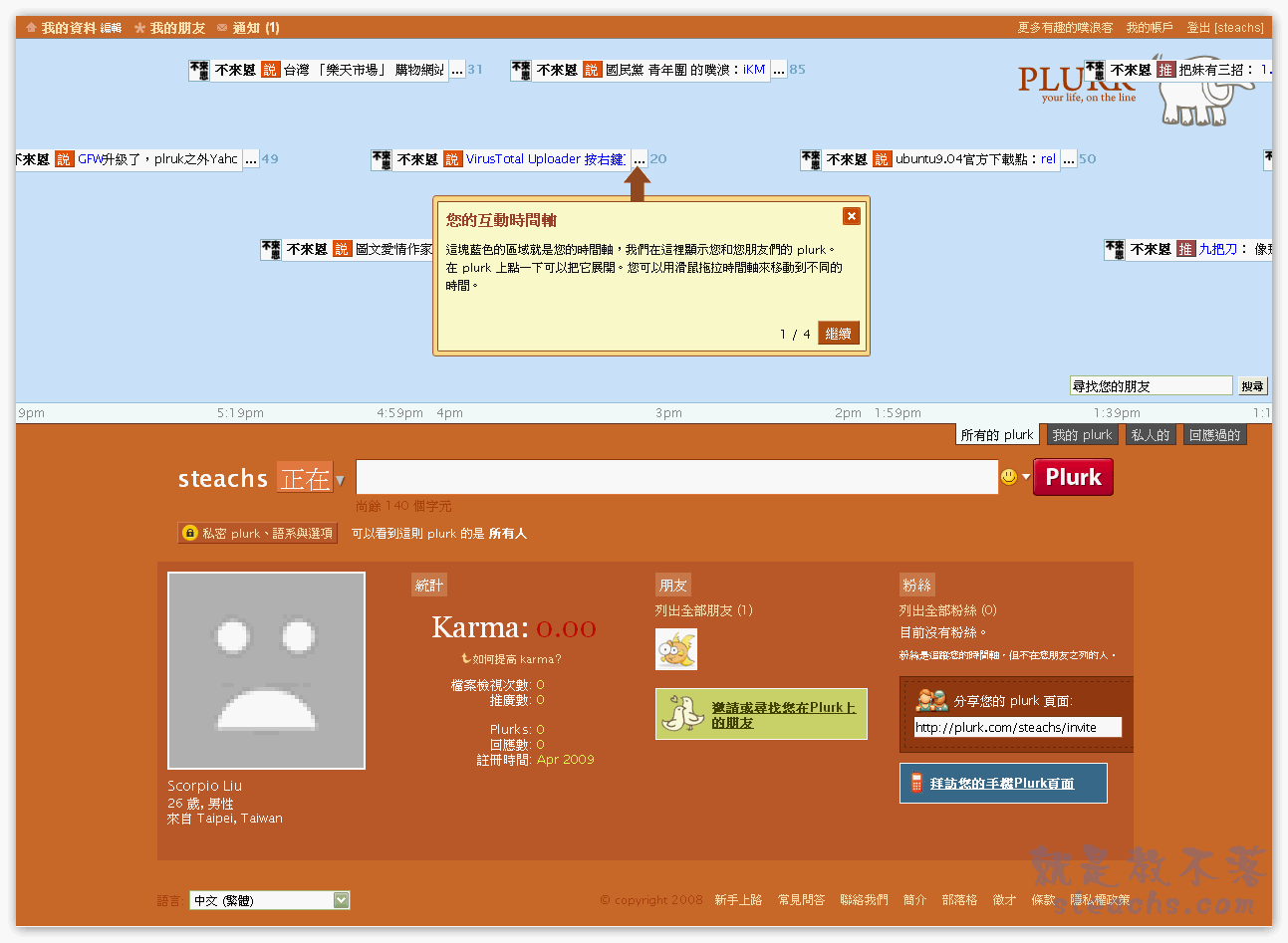 註冊就是這麼的簡單,連信箱驗証都不用,夠快吧,馬上進到你的Plurk頁面,
