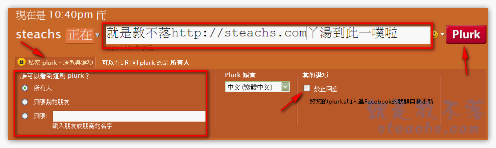 擇發送出去被觀看的權限,語系,或是禁止回應,輸入完想噗的話,再按下〝Plurk〞就會送出去囉