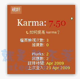 等等意思,而在噗浪中,Karma值關係到能設定的一些選項,Karma值當然愈高愈好,如何提高karma值可參考 http://www.plurk.com/Help/karmaHelp