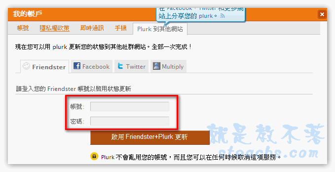 將你其它的網站帳密登錄進去的話,當你一發噗會同時幫你發佈到你有登錄帳密