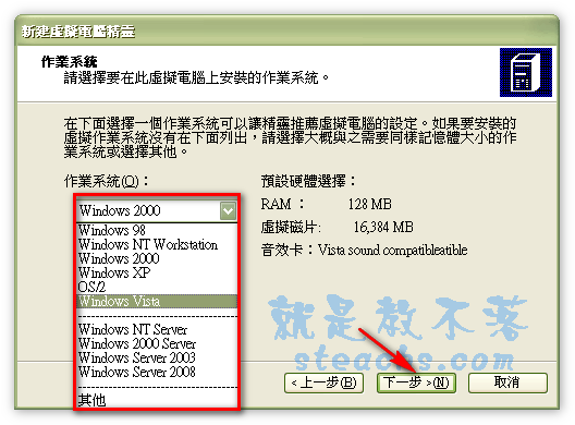 列表選擇只是給你一個參考值,比如說你選擇Vista,在右邊就會顯示出Vista的最低所需記憶體量及硬碟空間,但這其實沒差,往下可以再做調整,所以選哪一個不重要..