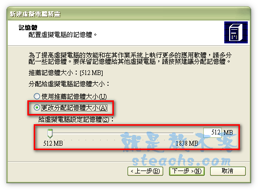 另可調整欲分配多少硬碟空間給虛擬電腦。可針對你想測試的作業系統來做調整。