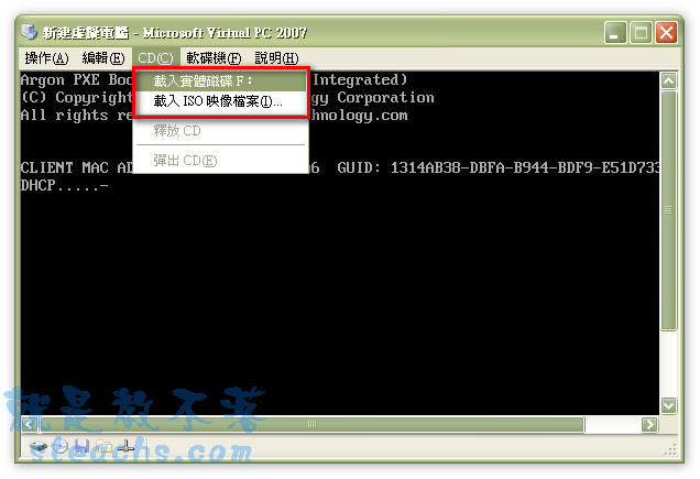或是ISO檔案來安裝,點擊〝CD〞,選擇載入實體磁碟(光碟機)或是載入ISO檔案