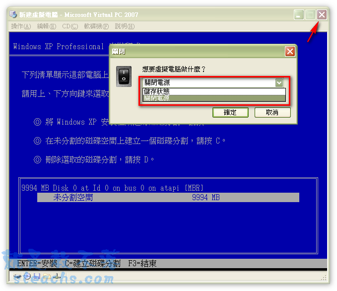 關閉電源:關閉視窗,停用虛擬電腦(等同關機的意義)