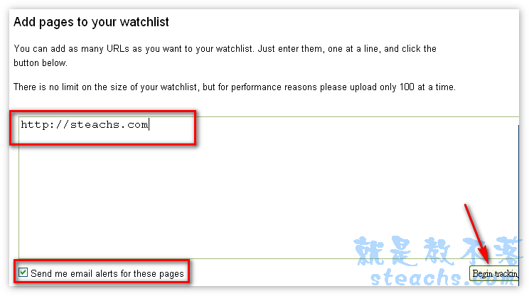 左下角的〝Send me email alerts for these pages〞勾選後,只要你追蹤的網站PR值有變更,就會以你註冊的Email通知你。設定完成後再按下右下角的〝Begin XXXX〞