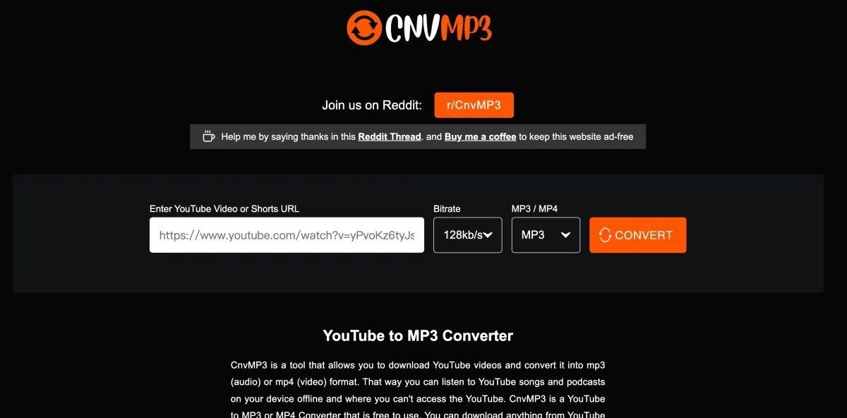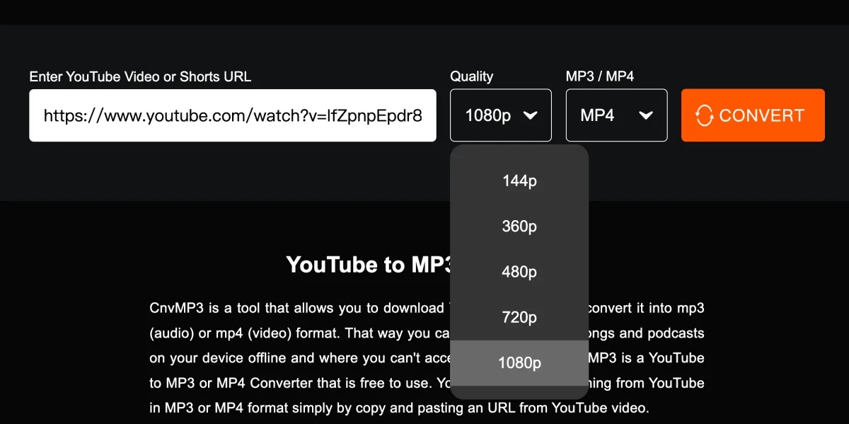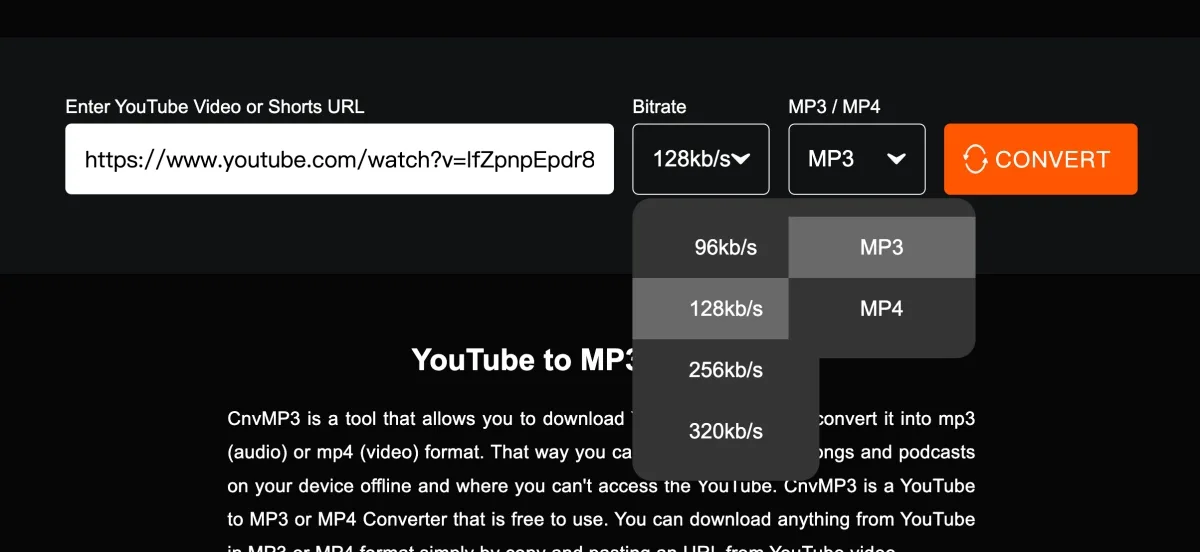 網站:https://cnvmp3.com/我想這類網站有用過的應該都駕輕就熟,使用都是大同小異,將要下載的影音網址貼上去後,選擇品質、格式,再按下 CONVERT 就可以搞定。