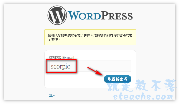 〝忘記密碼〞或是直接輸入網址 http://你的網址/wp-login.php?action=lostpassword,此方法是適用於輕度失憶的人用的,指還記得帳號和Email的人