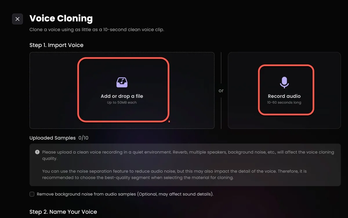 然後這裡可以自己上傳錄製的聲音,或者點撃右邊的 Record audio 來錄製聲音,至少要 10 秒,建議可以錄長一點,愈長愈精準。