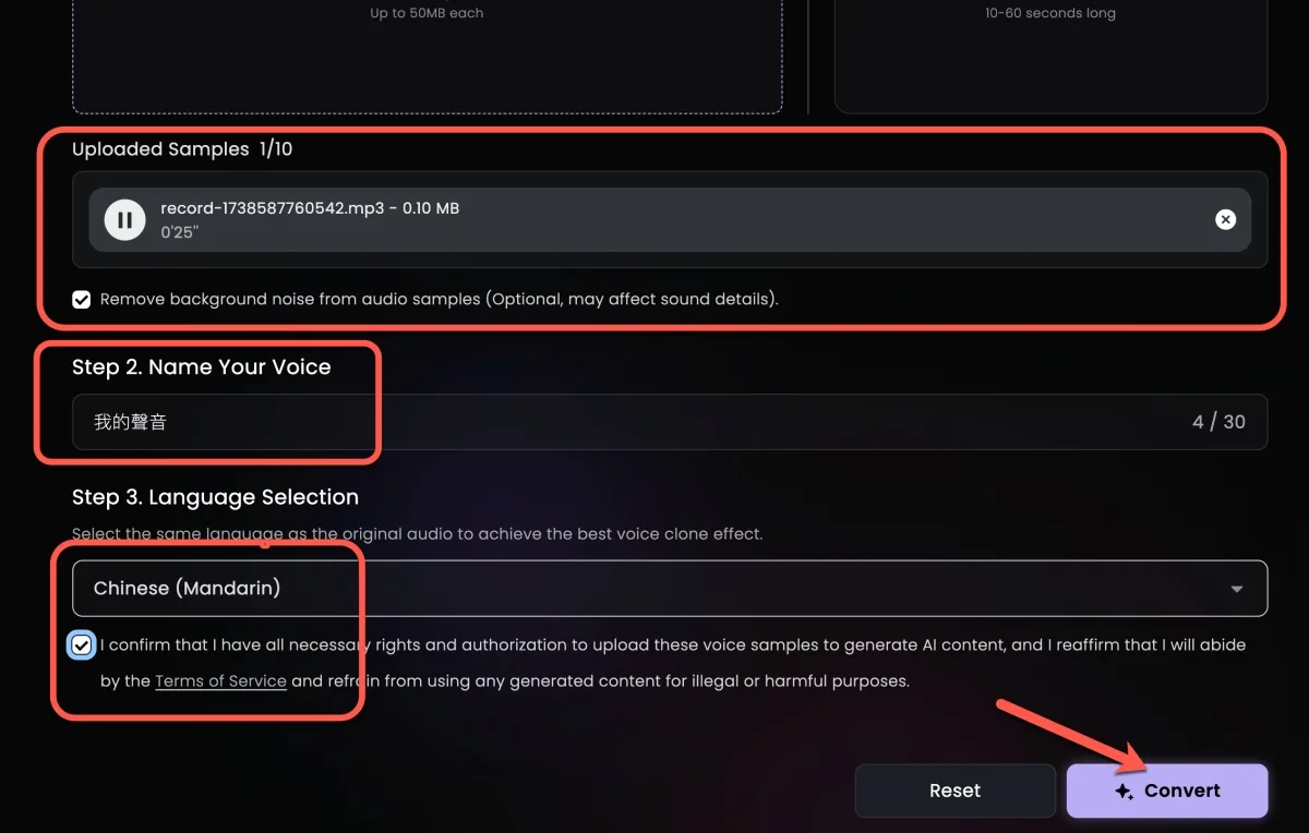 錄製完畢後,輸入聲音名字,下方勾選同意後就可以開始轉換。
