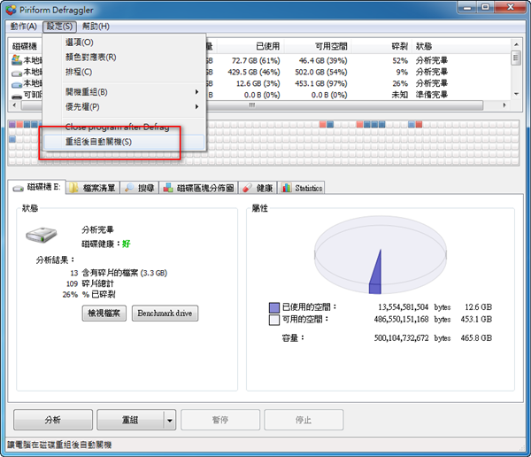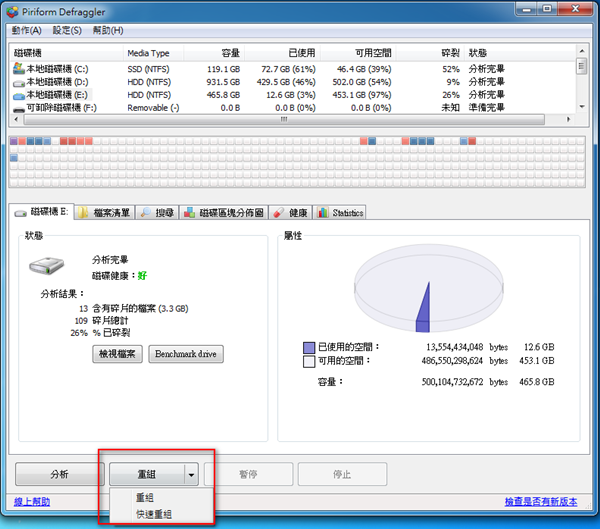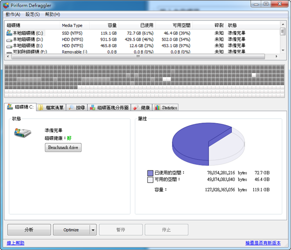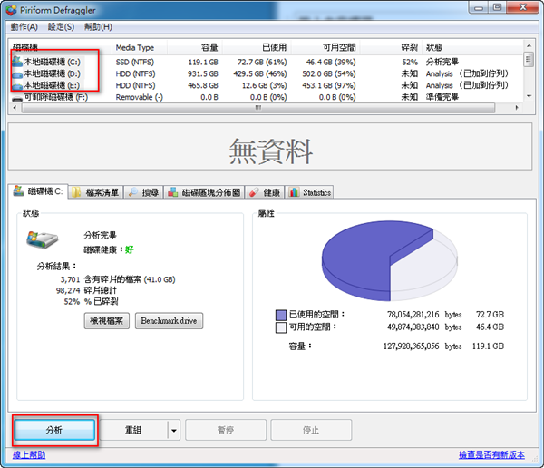 進入軟體時,在上面會顯示目前你電腦上全部的磁碟槽,分別可以看到容易及相關資訊,而碎裂狀態通常就是顯示未知,因為還沒有進行分析,所以也不知道應該重組誰,我們往下來看。