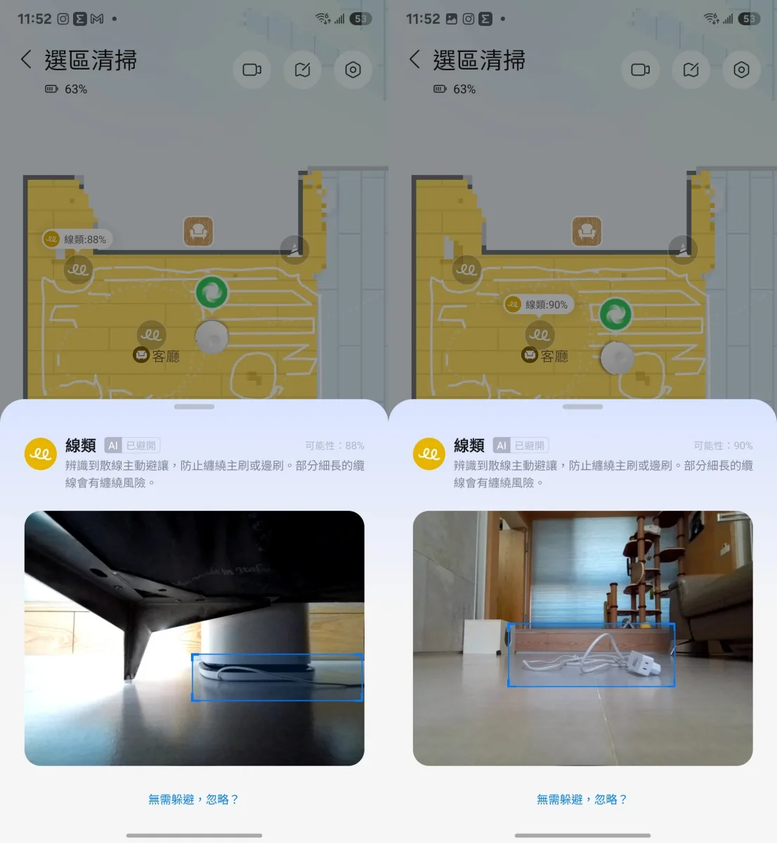 除了丟在地上的線材外,居然連我這收在沙發下只露了一小條電線也被辨識了出來。