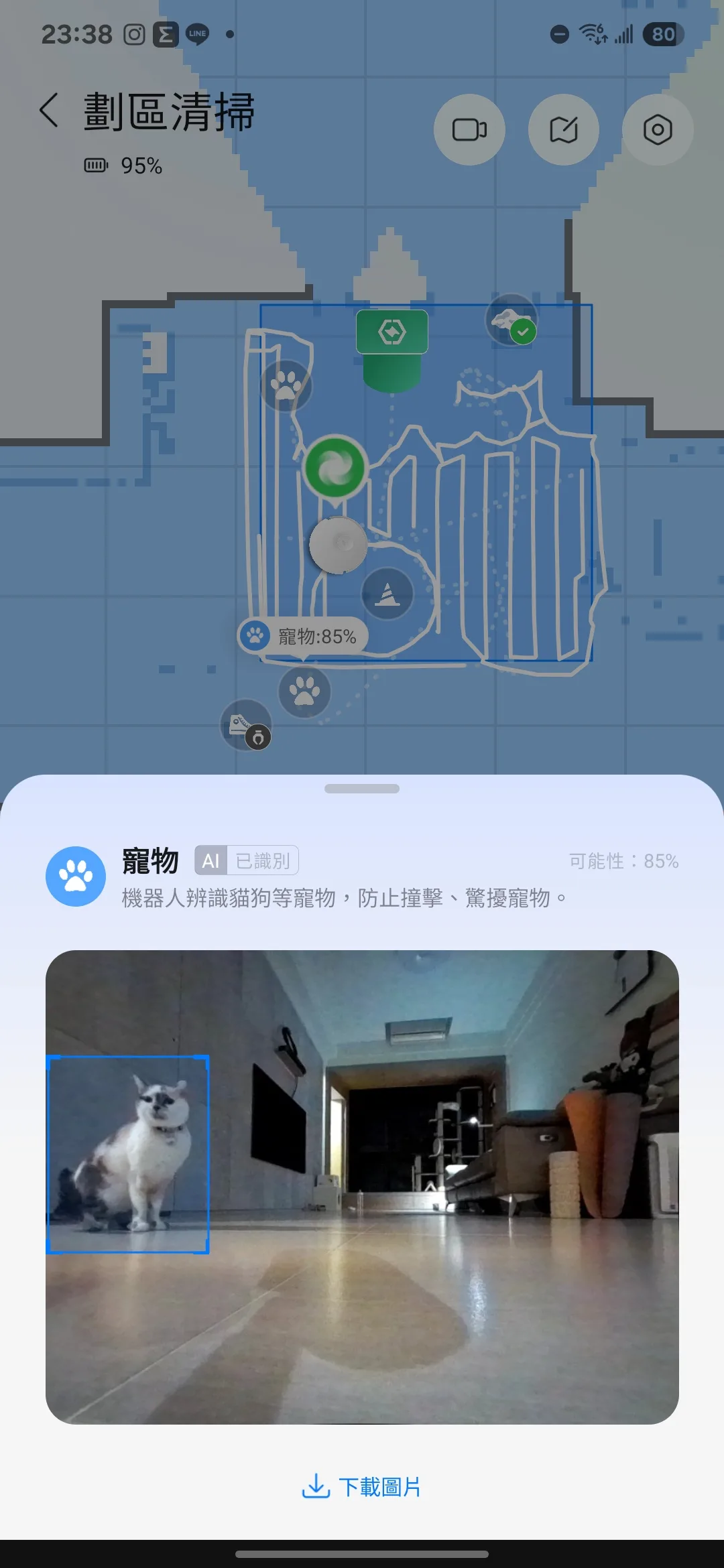 相關寵物的友善功能,像是清掃中順便拍攝下毛小孩的照片,可以一鍵找尋家中寵物的蹤跡,還能針對寵物用品的周圍加強清掃。