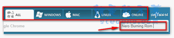 在首頁一進去的最上方,你就可以選擇分類(Windows、MAC、Linux、線上服務)後來做搜尋,比如站長用〝ALL〞來搜尋〝Nero Burning Rom〞