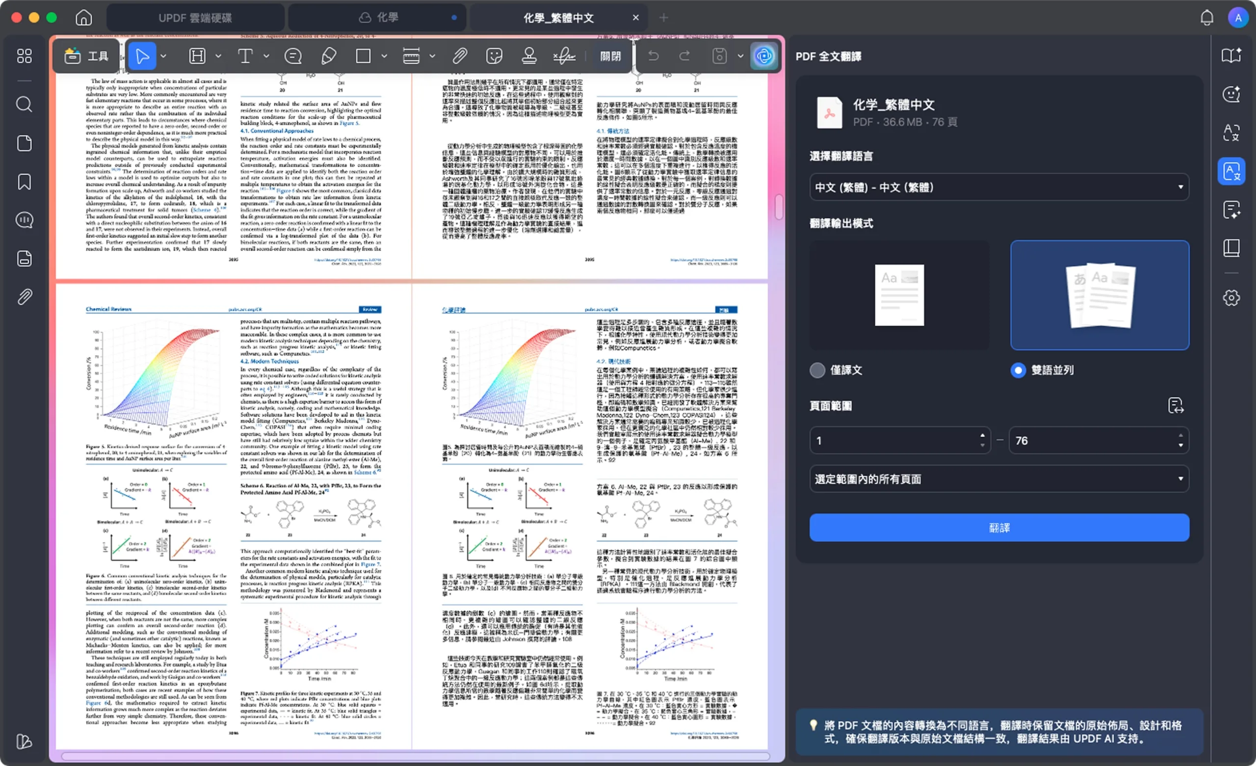 - 多場景翻譯模式: UPDF支援全文翻譯、分頁翻譯、劃詞翻譯及圖片翻譯四種模式,涵蓋中英日韓等主流語言。翻譯結果自動匹配原文排版,支援對照閱讀,打破語言隔閡,助力全球化協作。