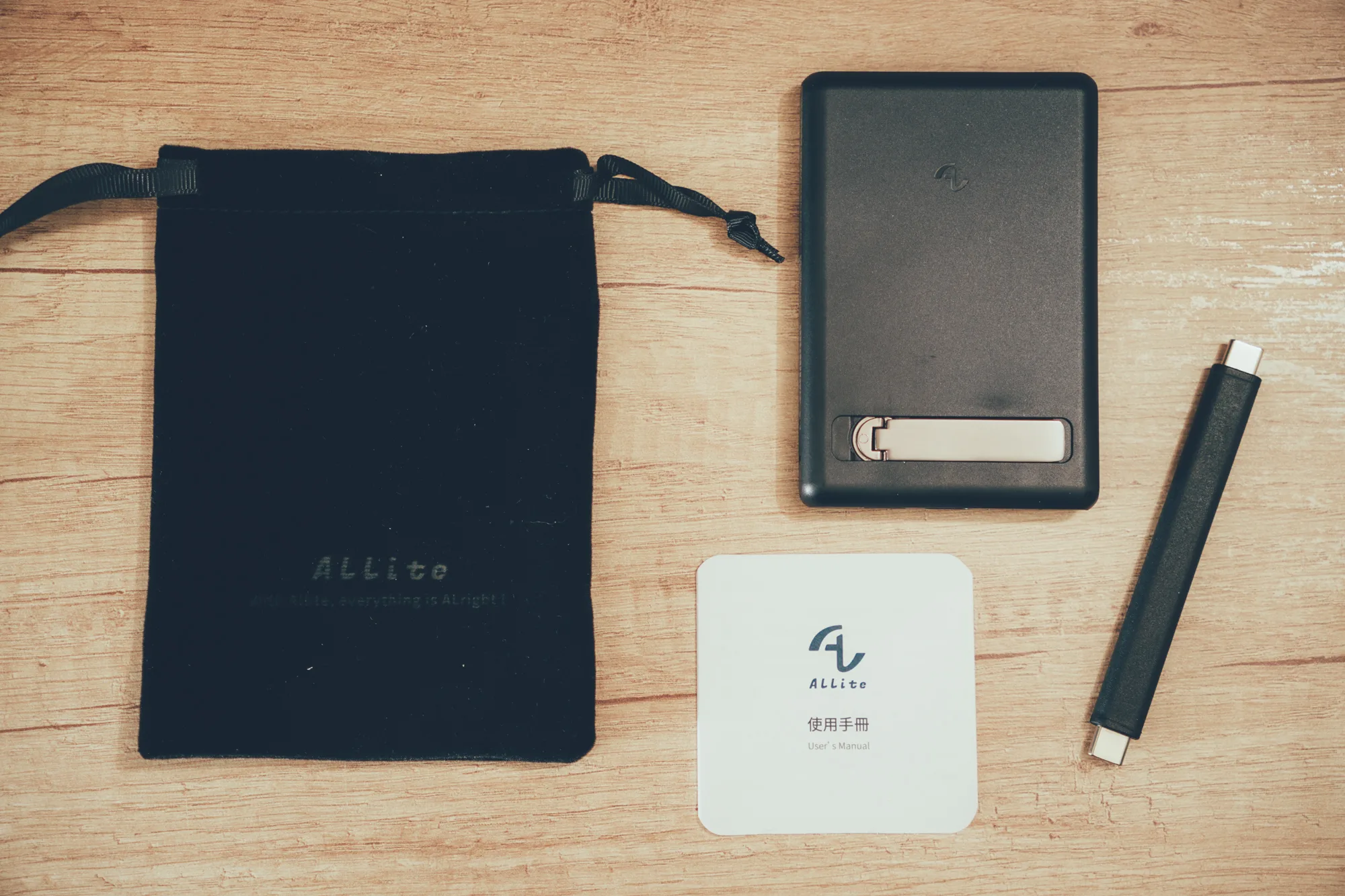 打開包裝後裡面配備超齊全!除了 Allite WP1 主體,還有超有質感的磁吸短線、絨布收納袋跟說明書,光是收納袋就讓整體質感大大加分~不管出門放包還是日常使用都很方便 🎒✨