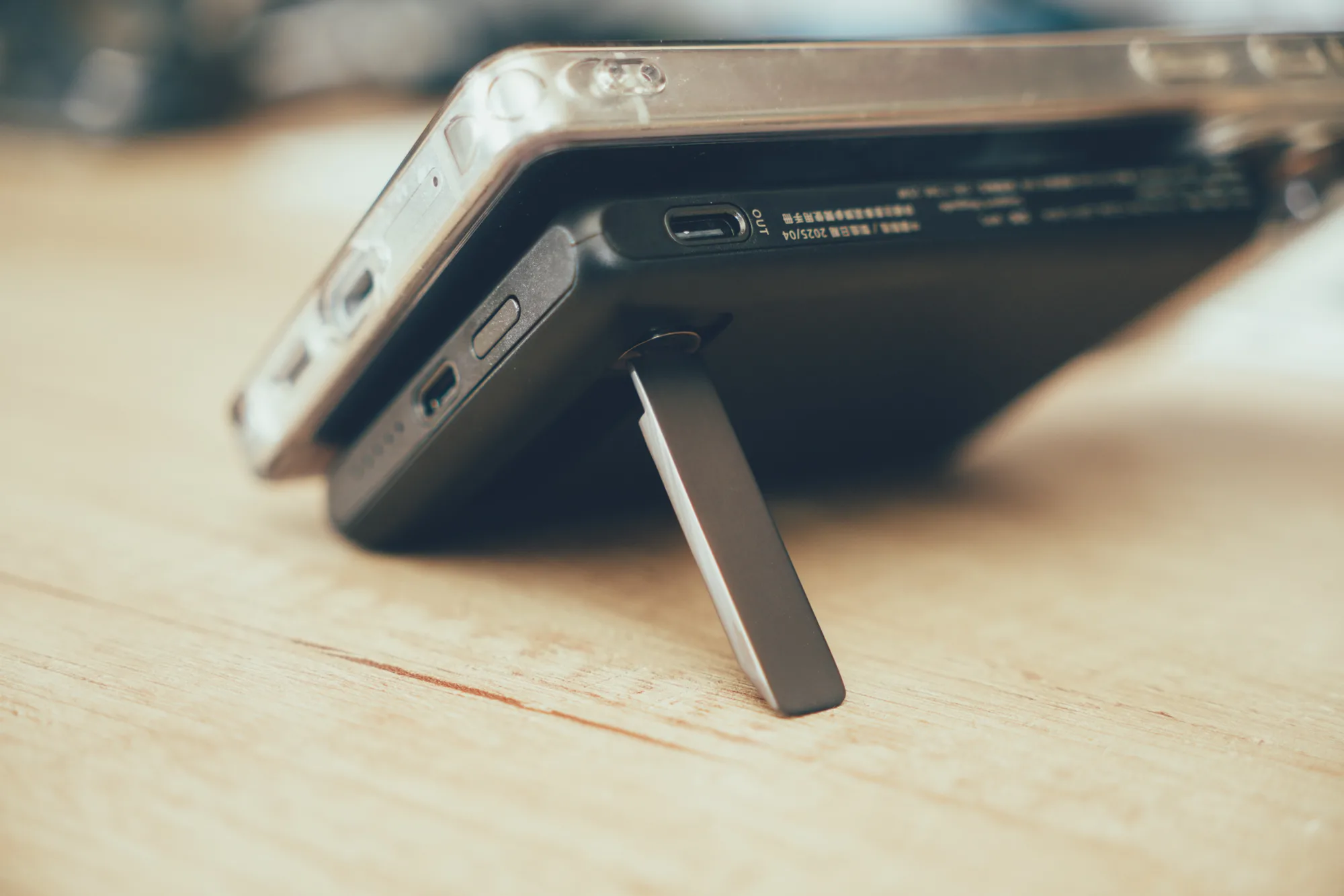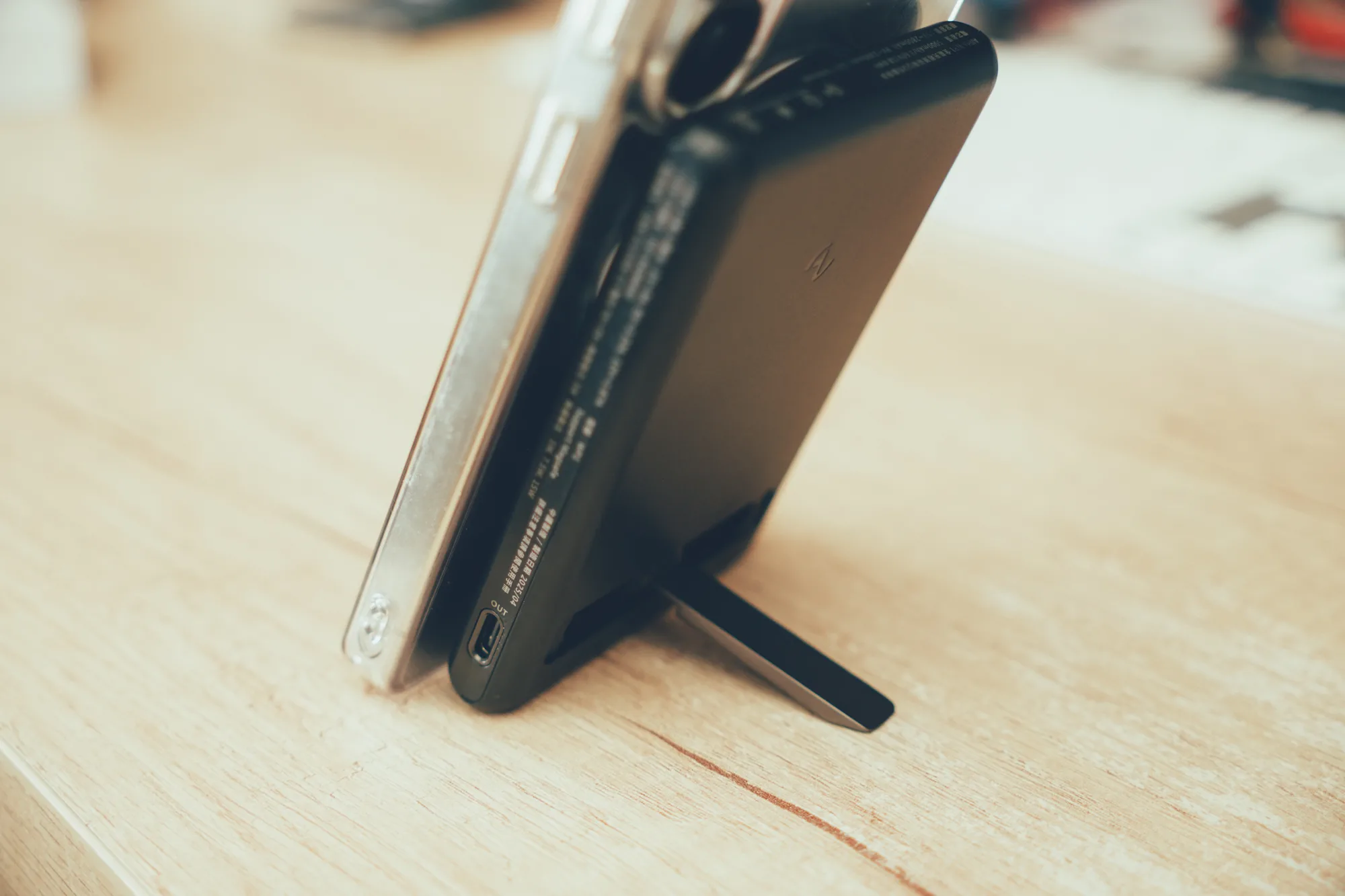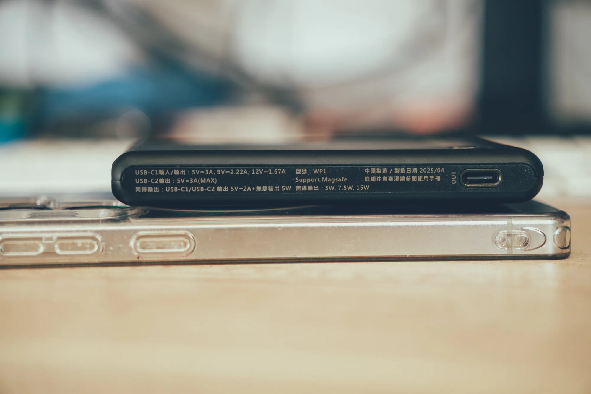 從這個角度就能感受到它的「輕薄」,行動電源厚度僅約 1.3cm,只比手機厚一點點,裝上後還是能輕鬆放進外套口袋不鼓包,完美演繹行動電源的極簡派 ✨📦