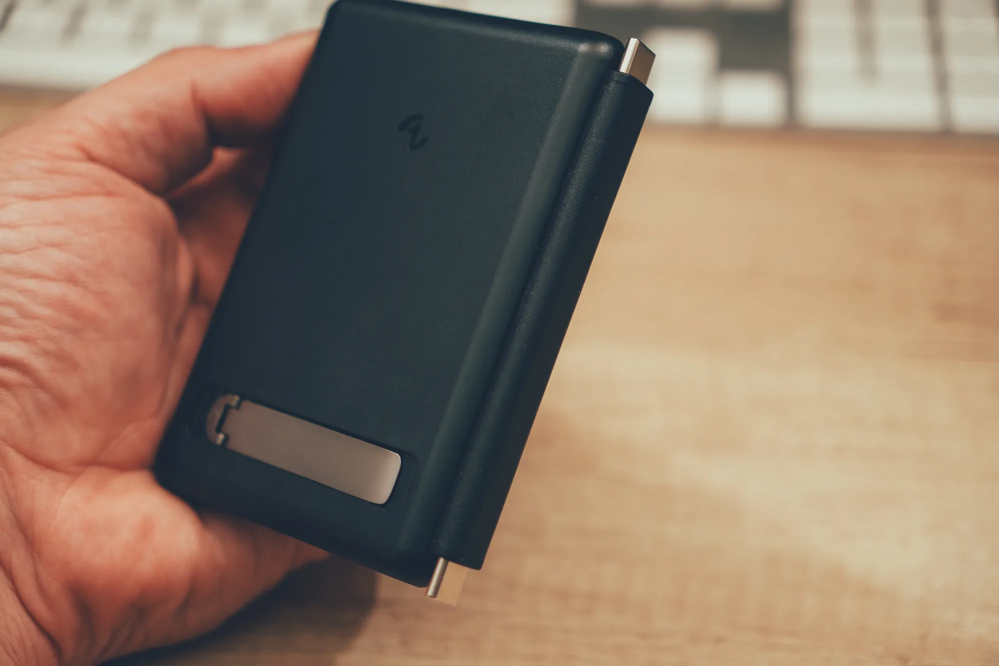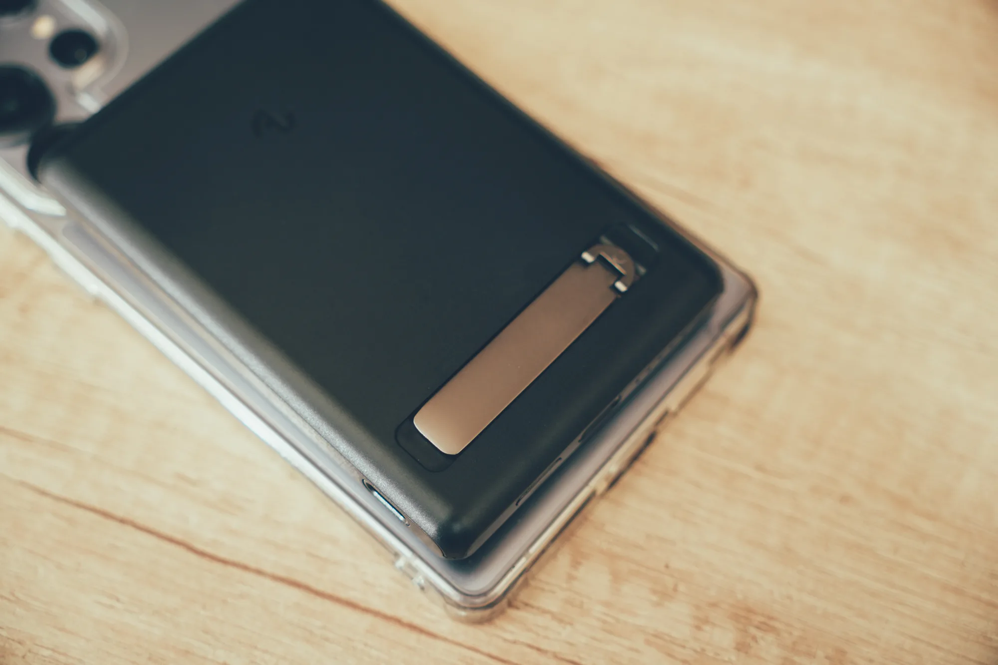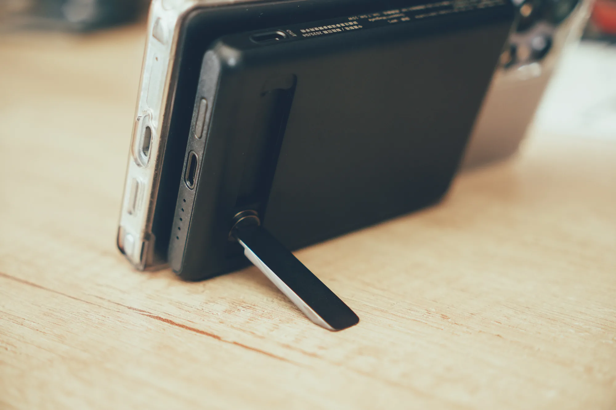 從這個角度就能感受到它的「輕薄」,行動電源厚度僅約 1.3cm,只比手機厚一點點,裝上後還是能輕鬆放進外套口袋不鼓包,完美演繹行動電源的極簡派 ✨📦