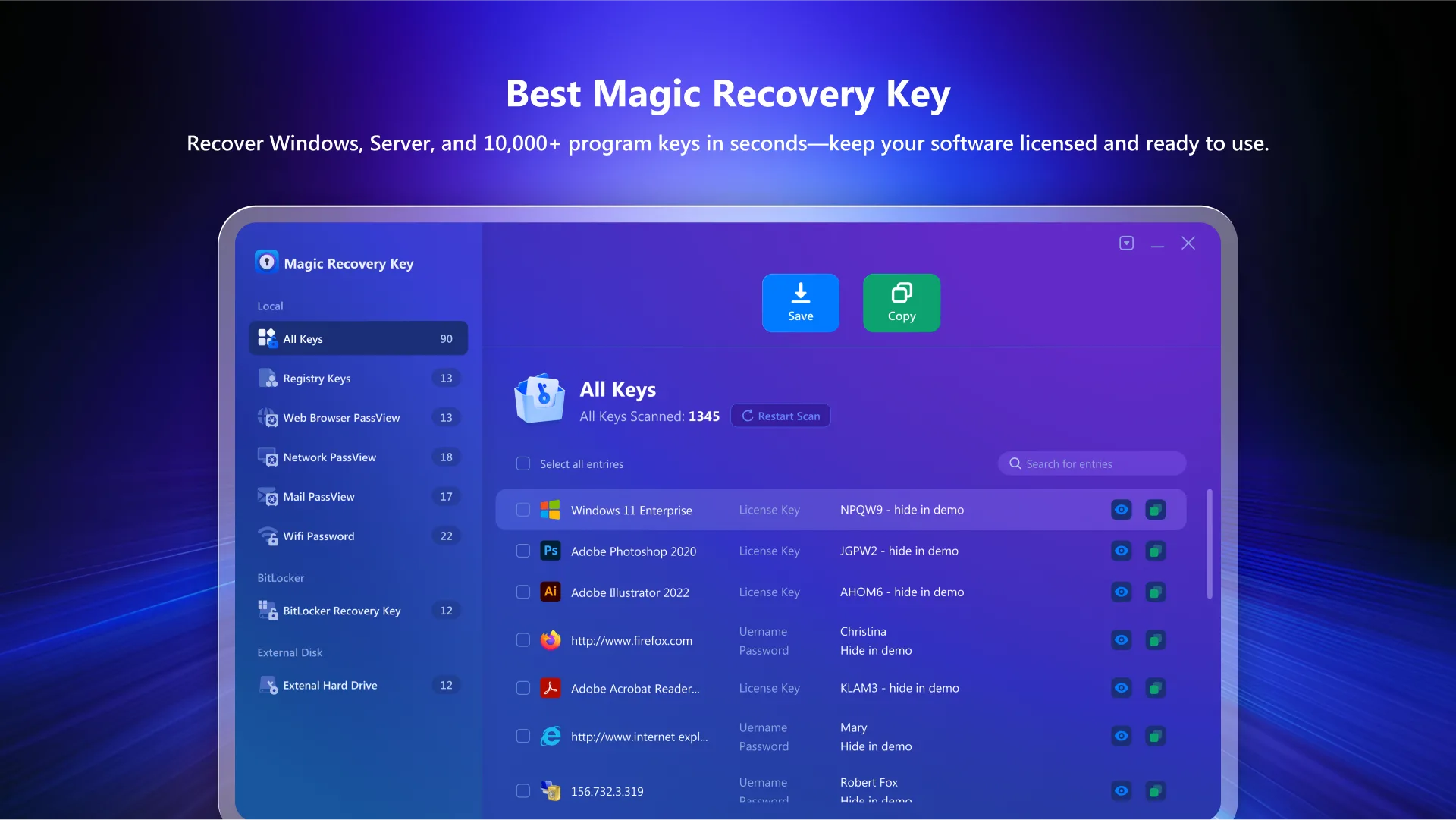 - 專注於恢復軟體的啟用金鑰、序號與授權資訊。