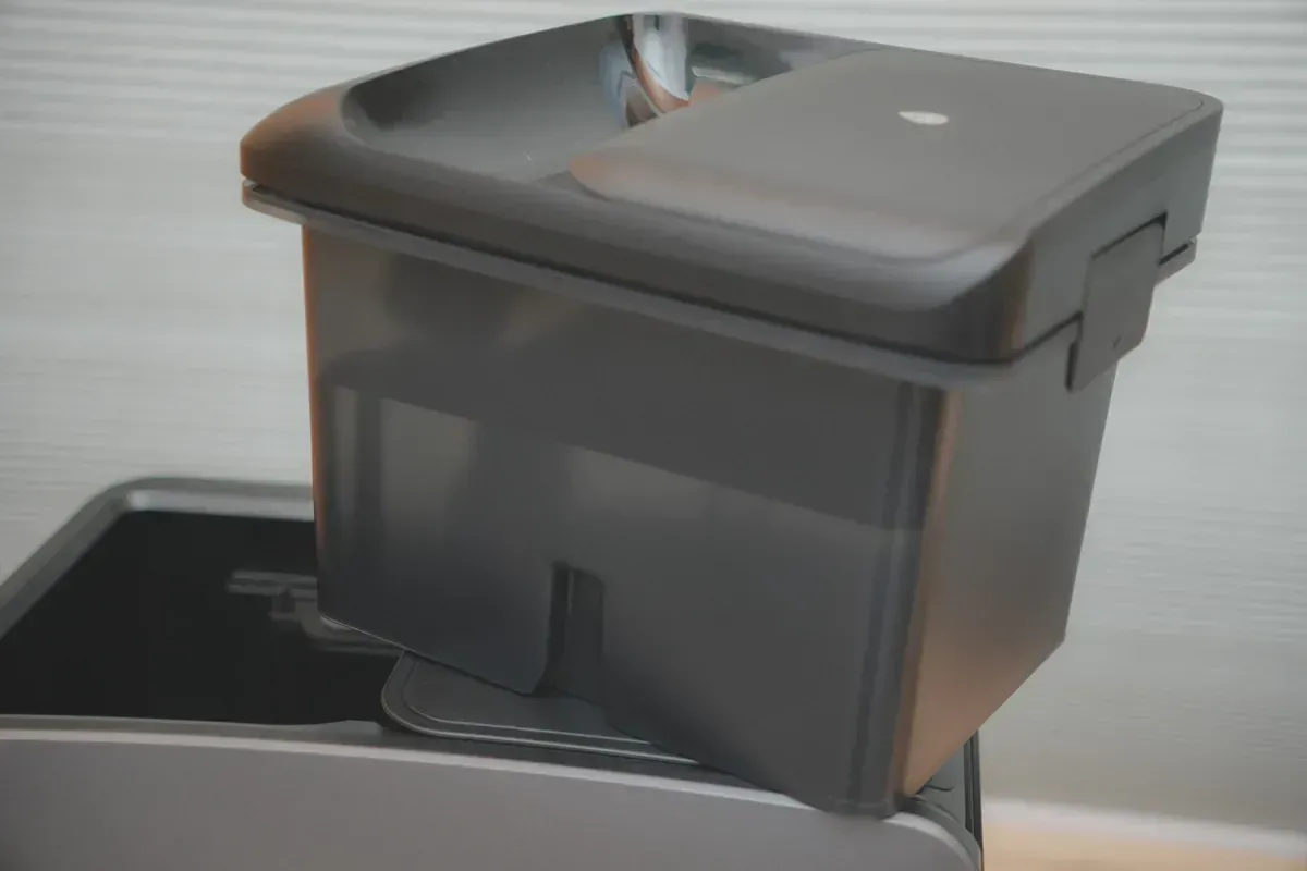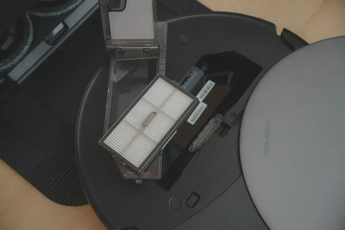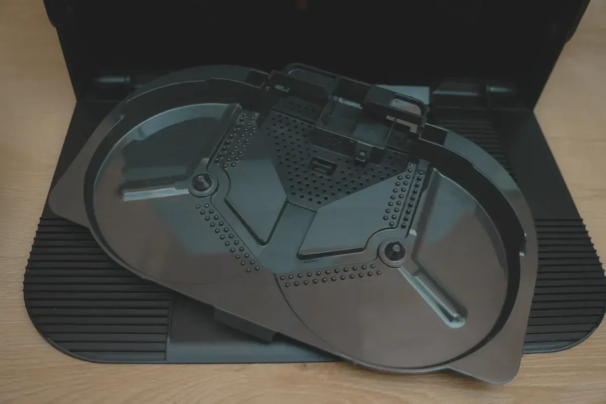 上方的蓋子採用磁吸設計,可以更輕易的拆裝,裡面是掃地機本身的集塵盒,雖然現在都會自動集塵,不過還是建議定期要取出清潔一下,或是更換濾網。