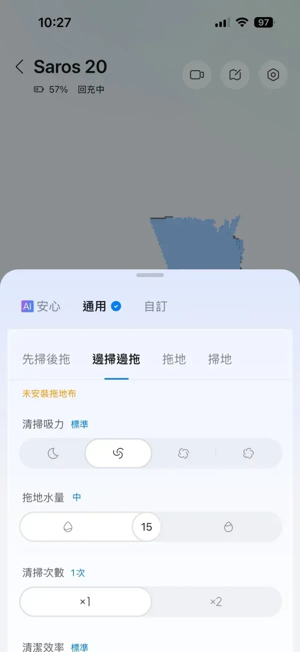 掃拖模式可以完全按照自己的需求來選擇,或是透過安心模式,自動依你家的環境,判斷後選擇掃拖的模式。