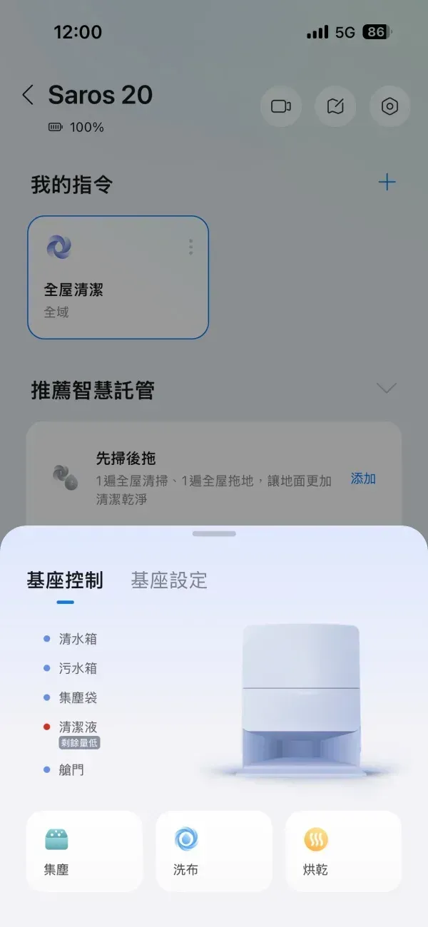 基座相關控制都可以自行選擇,比如你覺得拖布還想要多洗一次,那可以進到 App 手動按下洗布,洗完會自動啟動烘乾功能,或像洗完底盤,也可以來啟用烘乾功能。