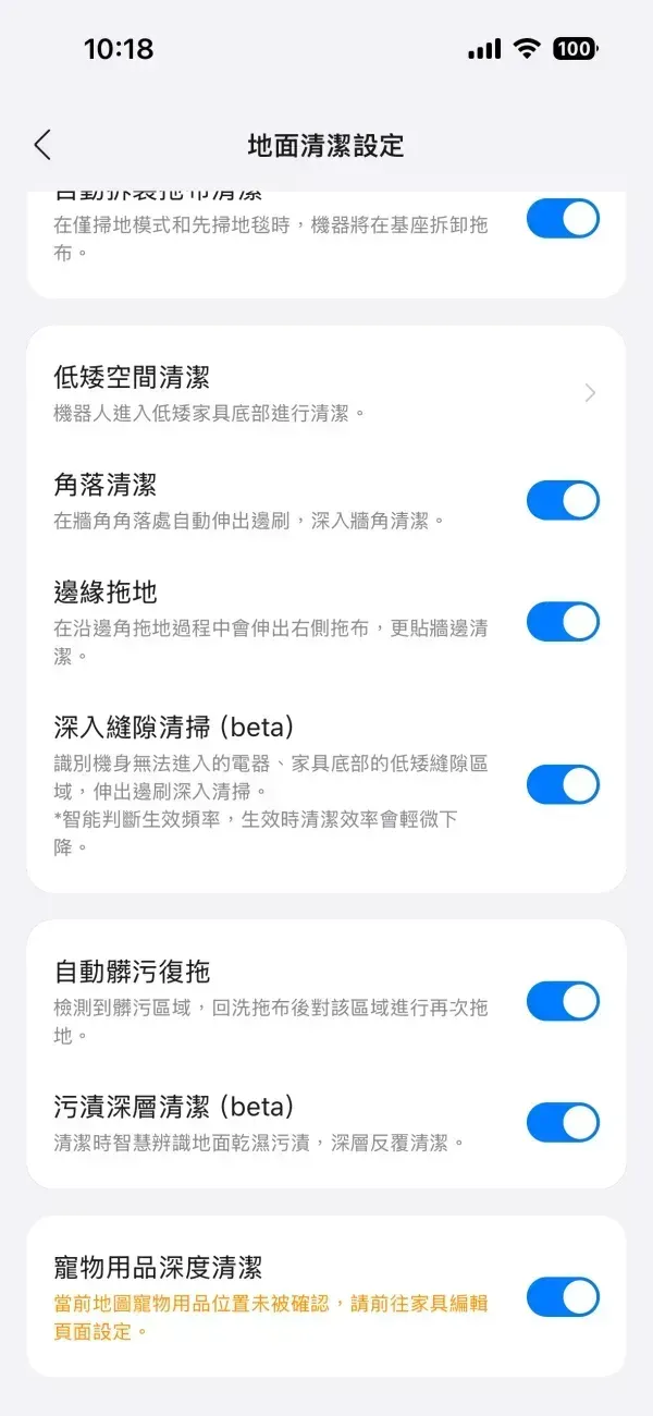 針對家中有寵物的部份,在設定裡有個寵物用品深度清潔,如果要清潔的區域有包含寵物用品可以在家具編輯那編輯,加強該區域的清潔。