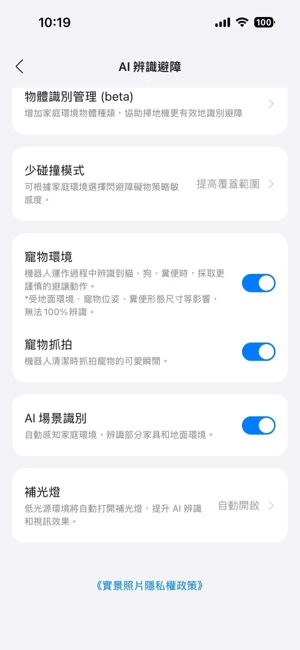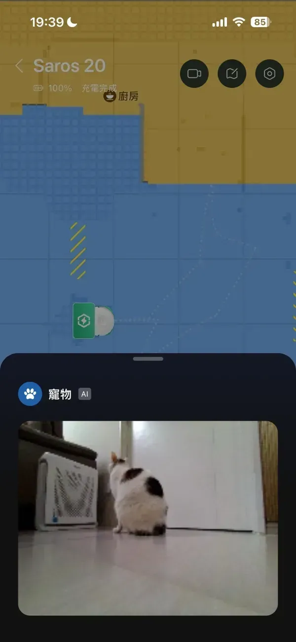 AI 辨識避障裡,也可以設定寵物環境、寵物抓拍,不用擔心中家有養寵物會影響掃地機的使用,還可以幫你拍下寵物的照片。